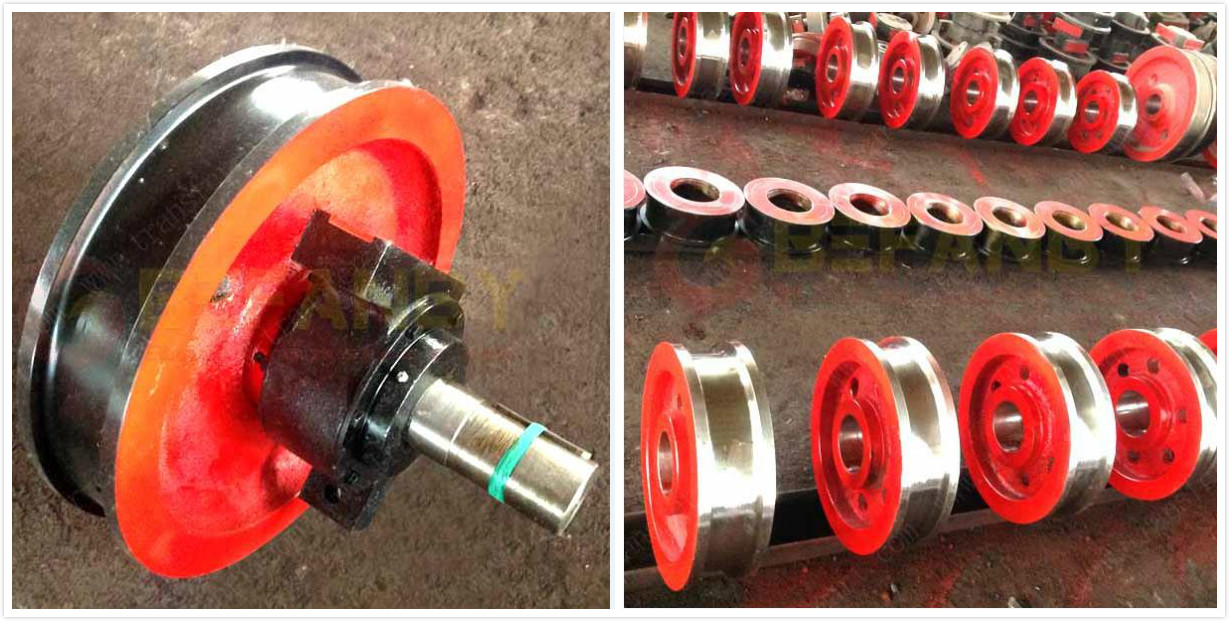 The wheel can be single flange and duble flange, the material is cast steel 55, and one wheel is equipped with two bearing pedestals, Large load capacity, Low noise, Rotate freely, material handling trolleys wheels. Lubricate the wheel every 180 days, easy and convenient.