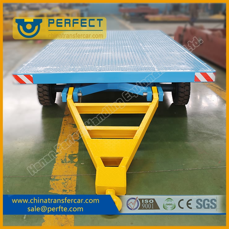 Henan perfect handling equipment co., LTD., production of electric flatbed trailer plate frame design is the box beam structure, the middle is a network of steel and steel plate welding structure, guarantee the surface deformation.The deformation of this frame is zero, and the deadweight coefficient can guarantee 120%.