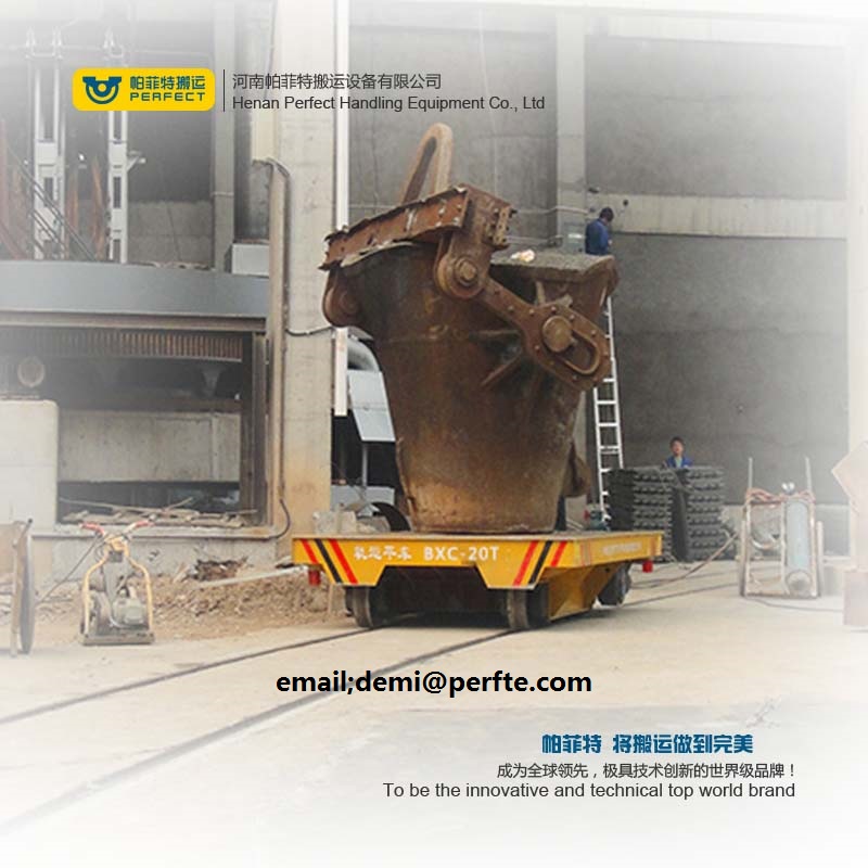 Molten melting steel ladle transfer car are used to carry hot metal ladles from one plant to the convector section. It is self-propelled type the power source is 220V/380V/415V AC power. Two individual drives are equipped for persistent high-heat working environment. Meanwhile, inverter is designed on for melting steel ladle transfer car steady start and stop. It can be increased weighting system, Led display, dumping device. We also can customized melting steel ladle transfer car running on curved rails.The series’ melting steel ladle transfer car is battery powered . The battery is installed in the melting steel ladle transfer car. The batteries supplied the electricity to the DC motor through the electrical control system. By this ways, we can make the melting steel ladle transfer car to start, stop, go forward , back ward , adjust the speed and so on.