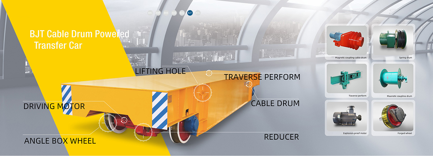 BJT Series transfer car is powered by cable .The power source 380v-690v alternating -current is supplied to the traction motor by cable ,which is controlled by control system to make the car start ,stop ,move forward ,move backward ,etc.The operation voltage is 360v which is safe voltage .Cable is collected and released by coiling device mounted underneath the car.The car can realize full automatic operation by PLC system .The series car can be applied in the environment such as severe environment ,high temperature ,anti-explosive etc.Simple structure and low cost make it popular for workshop transportation .Compared with BXC series transfer car ,there is no using time limitation ,and compared with BDG Series ,it has no strict demand for rail erection .The series car can be applied in the occasion with any loading capacity and high using frequency .If the running distance is beyond 50m, The trolley needs to install cable arrange to help with cable rolling .The max running distance is up to 200-400mm.The working principle of this type of electric flat cart is as follows: the flat cart is powered by cables and driven to walk by motors. The flat cart is equipped with on-board control buttons, which can control the flat cart to move forward, backward and stop. The flat cart is braked by electromagnetic brake motor, which is stable, reliable, safe to use and convenient to overhaul.Transfer Carts are a cost effective, safe and flexible load moving transporter to move loads from 1 to 500 tons. Perfect Transfer Carts produces solutions for the needs of businesses with the transfer carts. While the produced transfer carts can have Rail transfer carts or Trackless transfer carts (Multi-steering transfer carts).Rail transfer carts moving on a pre-placed rail track can be preferred especially for businesses that carry out regular load transfer from one point to another on a fixed line.Trackless transfer carts(Multi-steering transfer carts) with high maneuverability and without rail can perform transfers independently of the route.Transfer carts can operate on standard floors and do not require complex or permanent installation.In addition to flat ground, Transfer carts can also be driven on the ground with a certain slope range with a load.