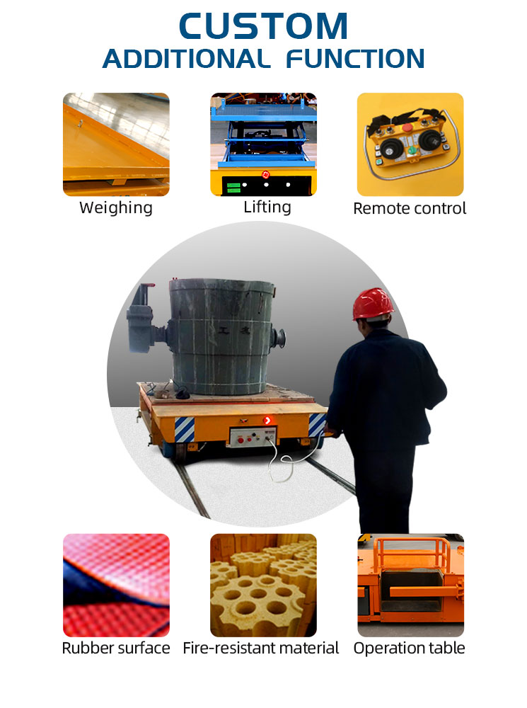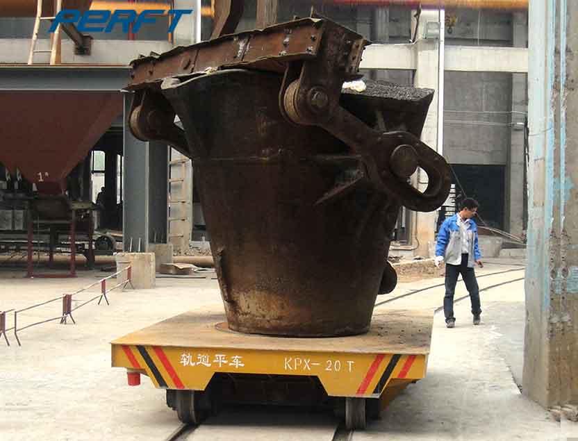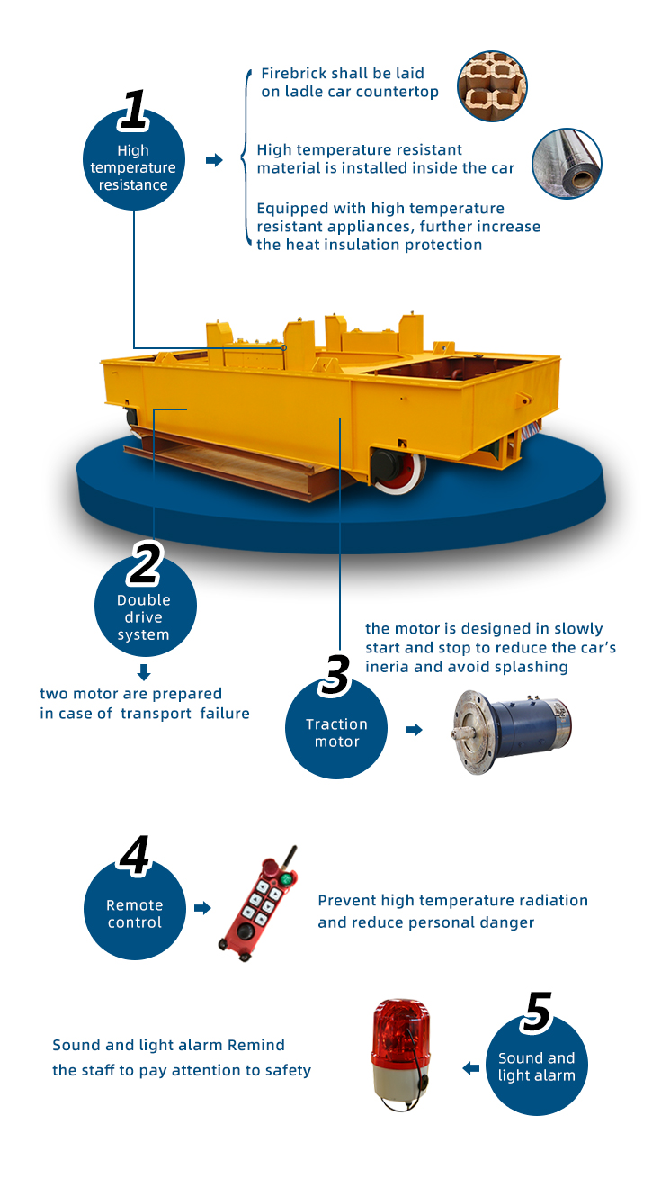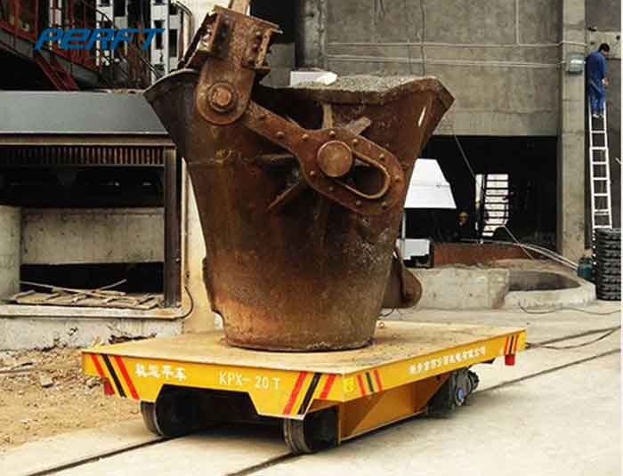 The High temperature explosion-proof aluminum transfer ladle car is commonly applied to transfer steel ladle, aluminum ladle, lead ladle, steel slag etc. with the functions of steady traveling, stepless speed regulation.Generally the outer surface temperature of the High temperature explosion-proof aluminum transfer ladle car around 200-300 degree , due to the high temperature the ladle transfer cart should be designed with Insulation explosion proof process, especially to the battery, motor, reducer and electric appliance.